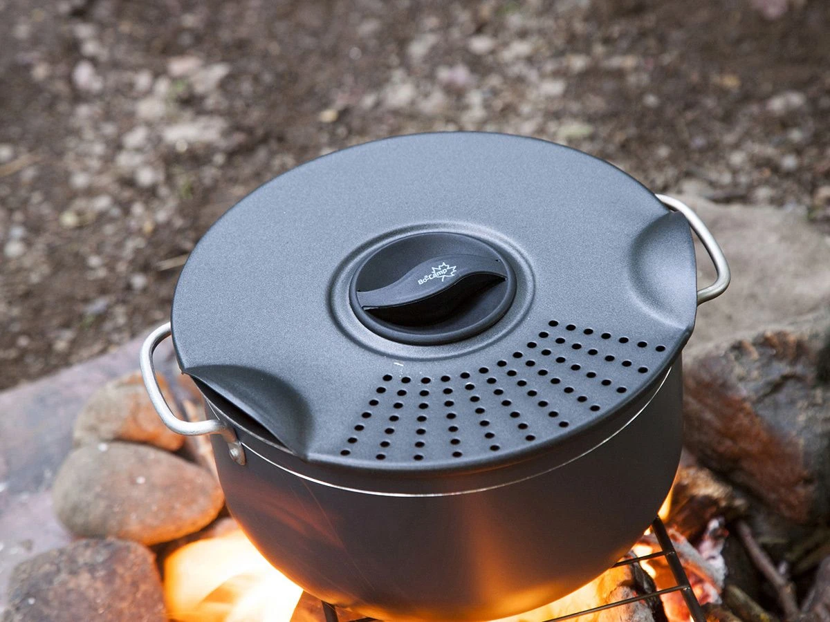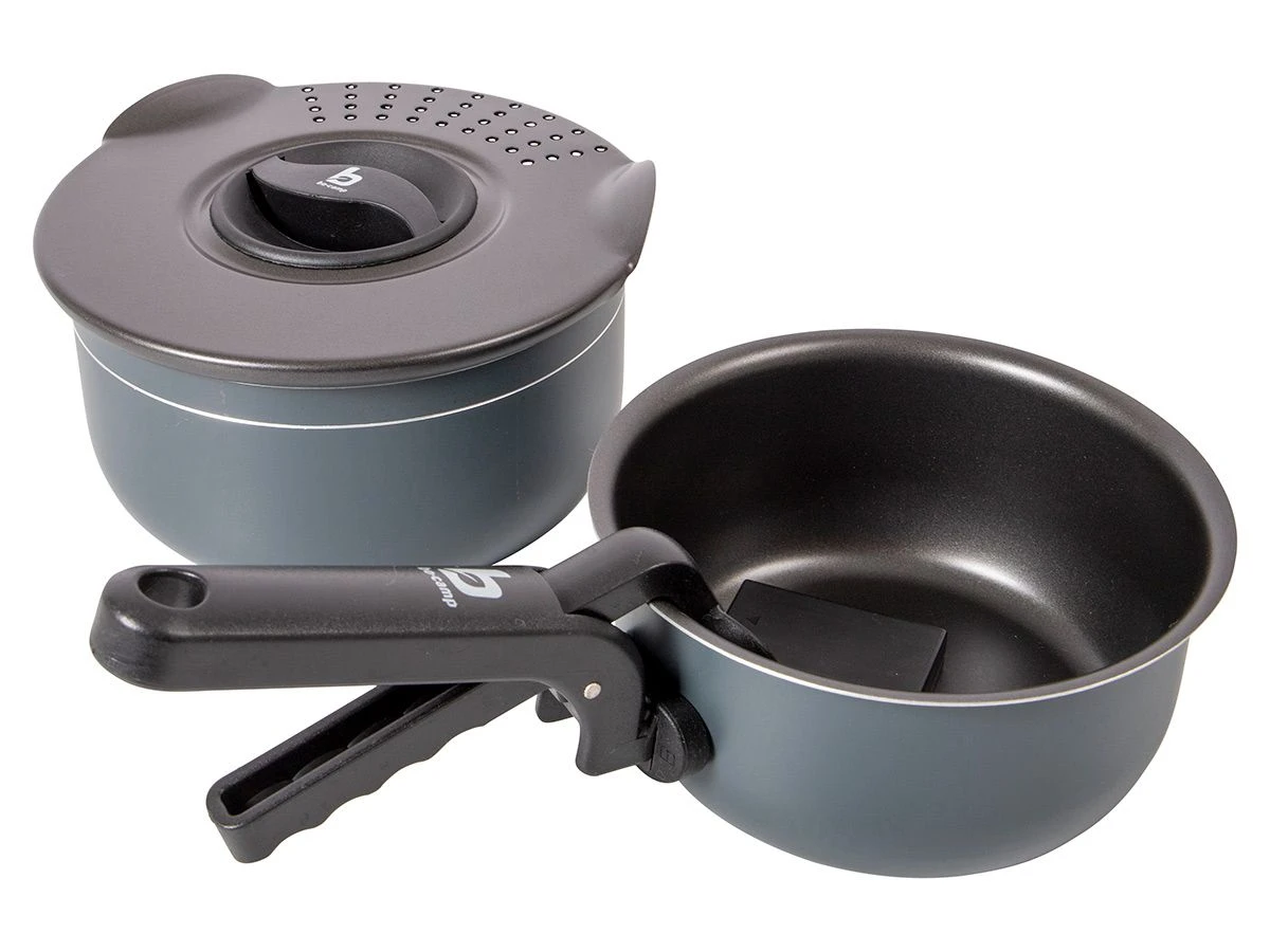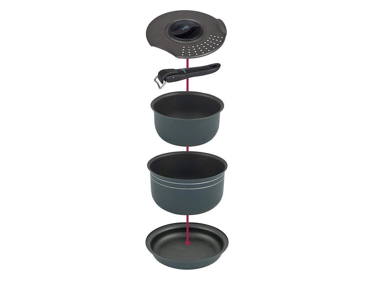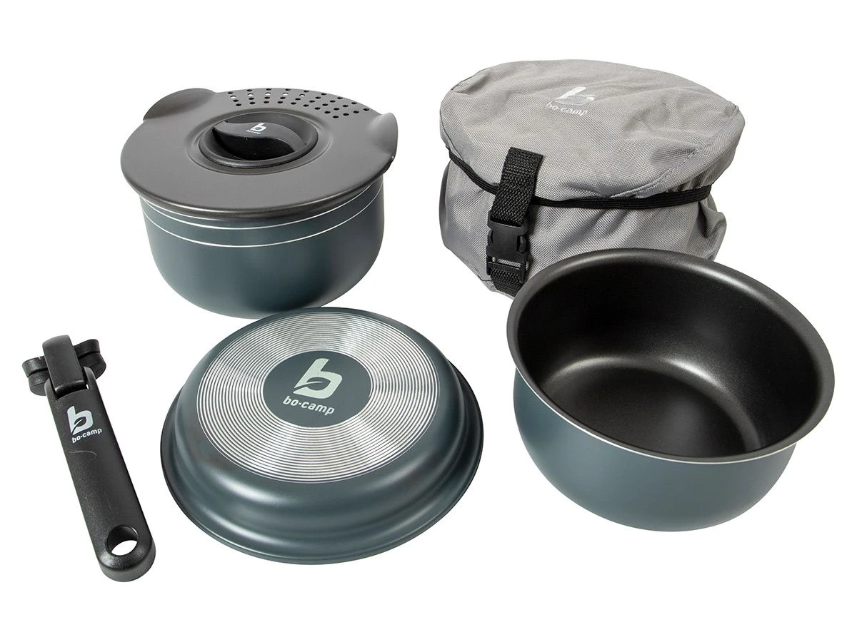 Deze compacte lichtgewicht pannenset van Bo-Camp bestaat uit twee pannen, een koekenpan, een handige afgietdeksel en een losse pannengreep. Deze pannen hebben een poedercoating aan de buitenkant en een anti-aanbaklaag aan de binnenkant. Te gebruiken op de warmtebronnen gas, keramisch en elektrisch.