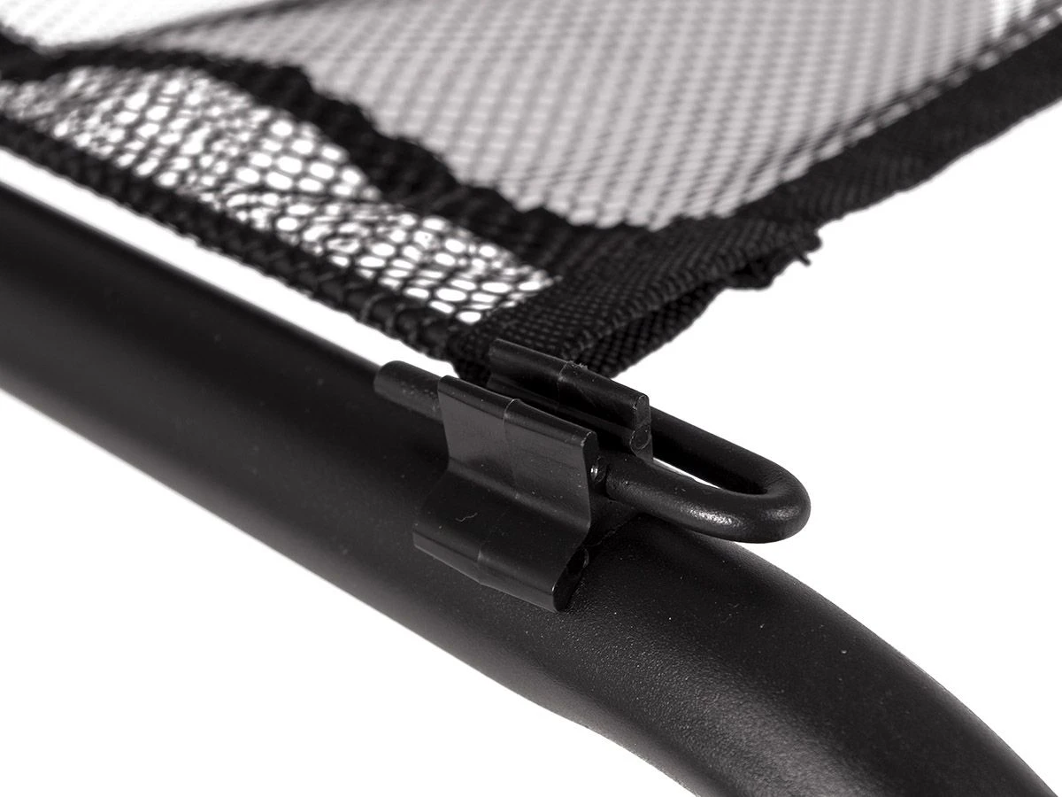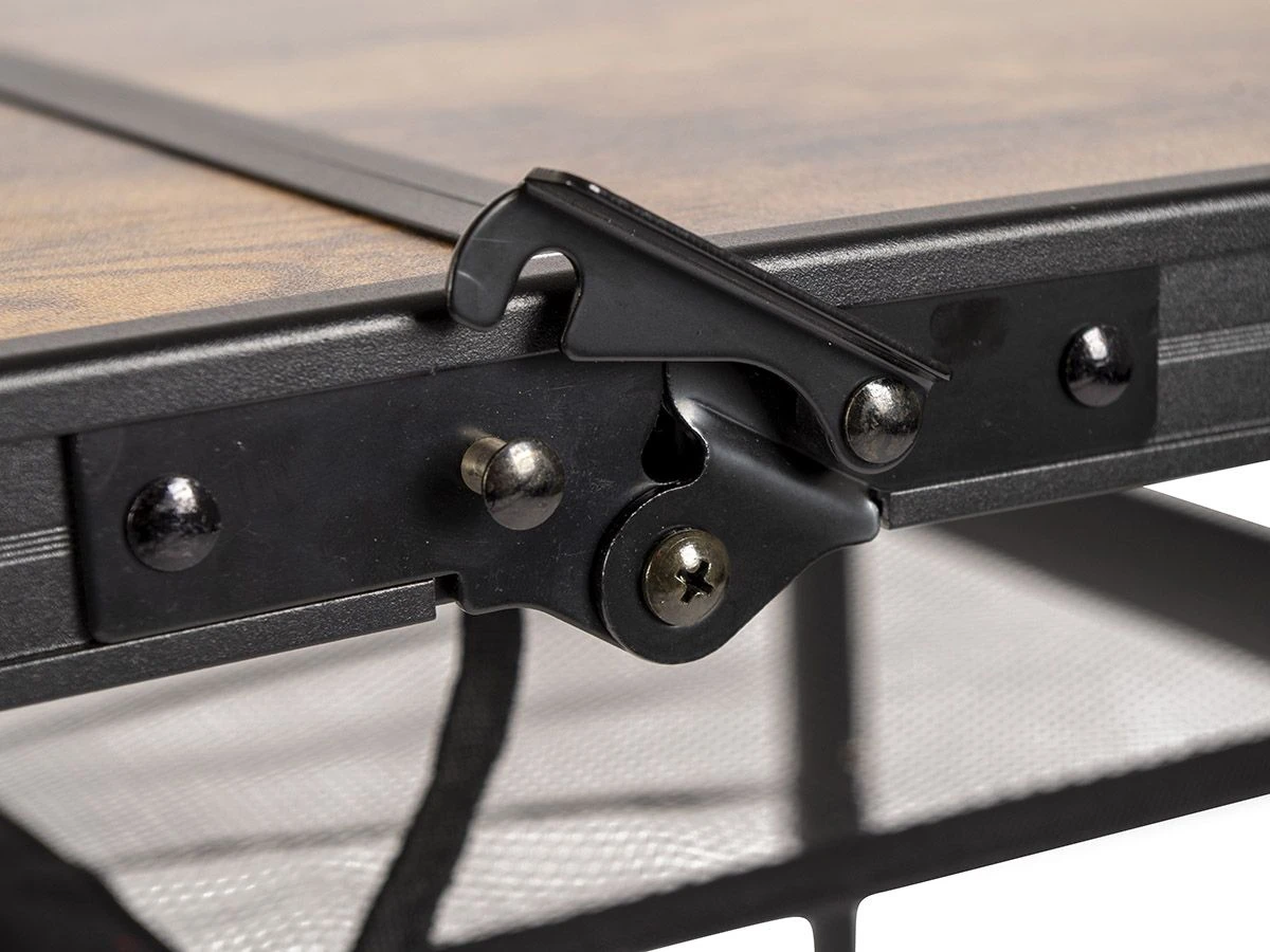 De afneembare tafelpoten zijn op te bergen onder het tafelblad, vervolgens is de tafel tot een compact pakket dubbel te klappen. Dankzij het handvat kun je de tafel makkelijk meenemen. Het zwarte frame is gemaakt van aluminium met daarop een MDF tafelblad. De tafel is dus niet bestand tegen water en hitte!