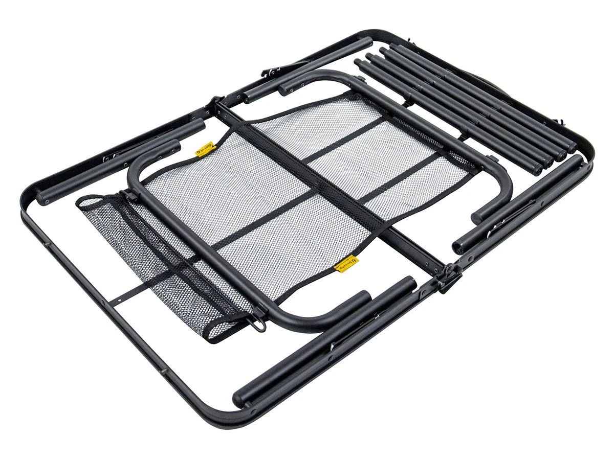 De afneembare tafelpoten zijn op te bergen onder het tafelblad, vervolgens is de tafel tot een compact pakket dubbel te klappen. Dankzij het handvat kun je de tafel makkelijk meenemen. Het zwarte frame is gemaakt van aluminium met daarop een MDF tafelblad. De tafel is dus niet bestand tegen water en hitte!