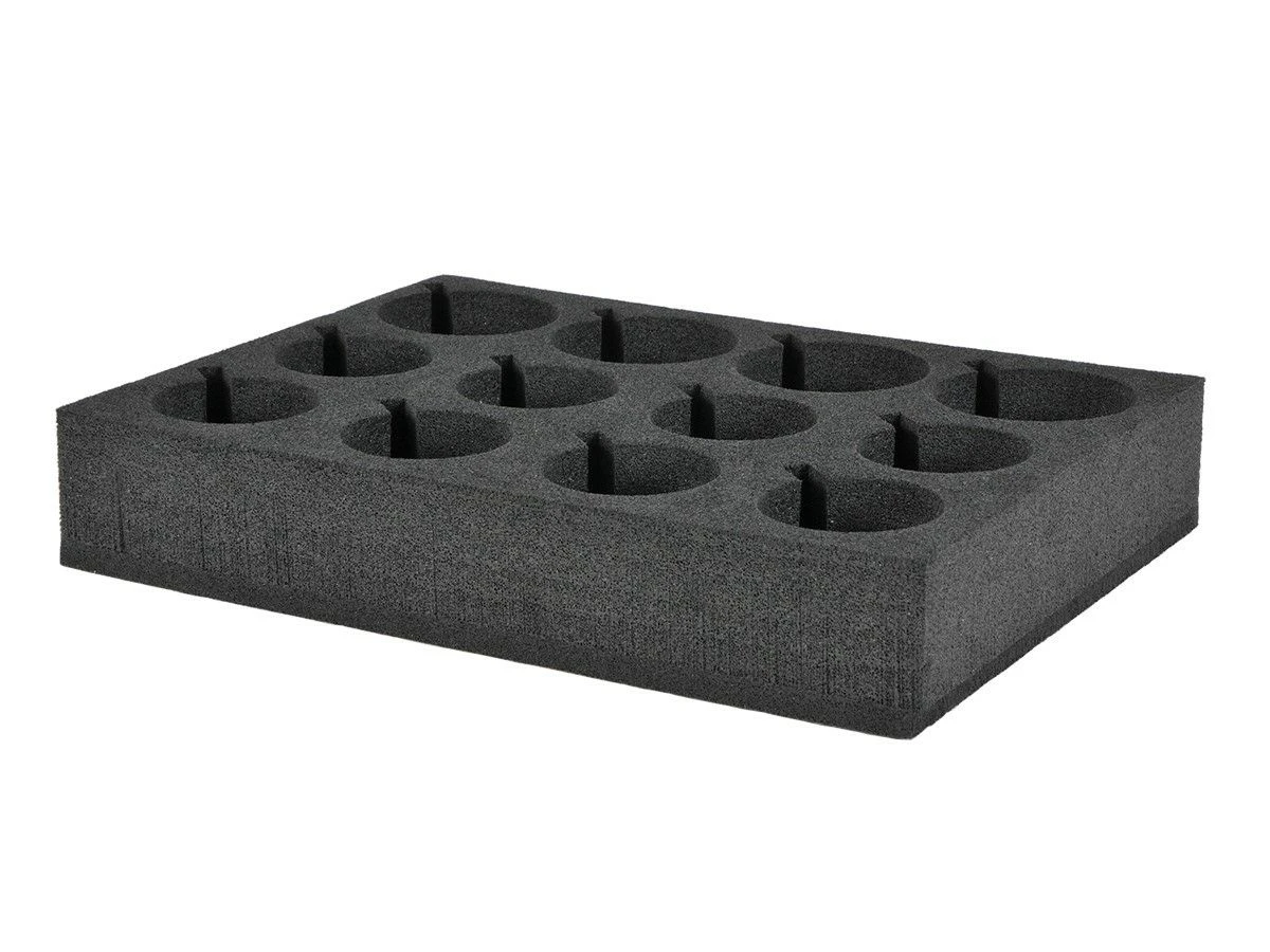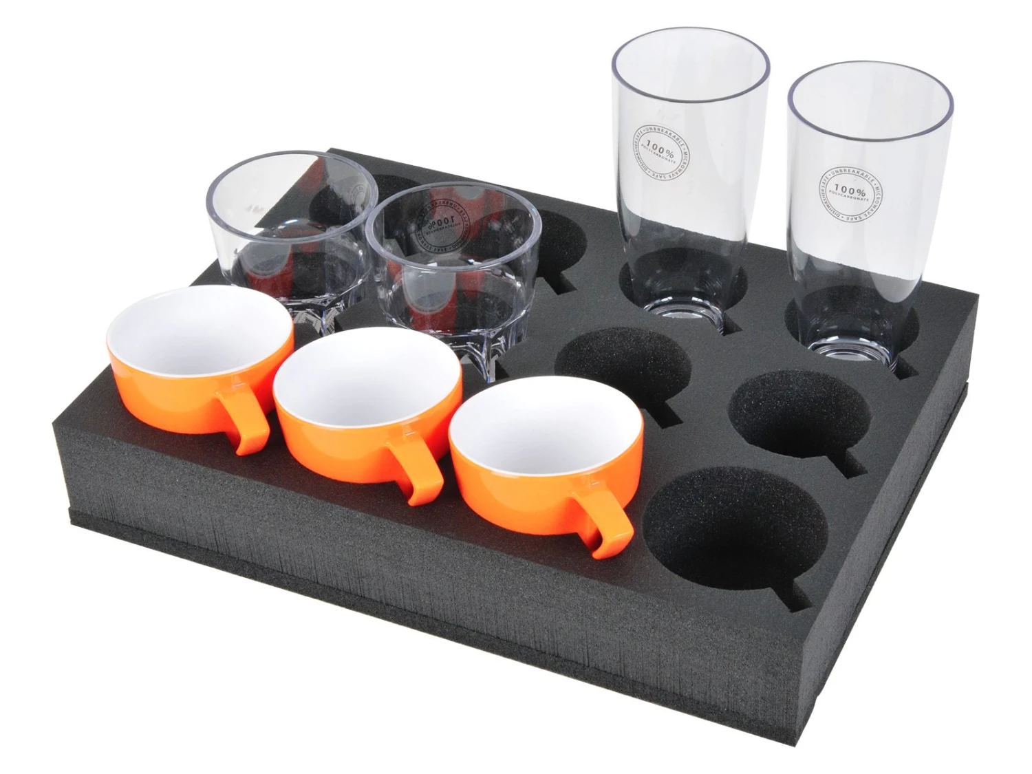 Universele glazen/bekerhouder geschikt voor 12 glazen/kopjes gemaakt van stevig schuimrubber. Ideaal voor transport en opslag zonder gerammel en bescherming tegen breuk tijdens het rijden. De uitsparingen met verschillende diameters voor glazen en kopjes zijn passend voor de populaire standaardmaten. Extra uitsparingen voor de handvatten zorgen voor een perfecte pasvorm.