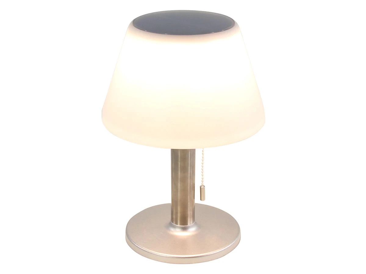 Deze tafellamp is geschikt voor zowel binnen als buiten en laadt zichzelf op met zonne-energie. Onder de kap hangt een kettinkje waarmee je de lamp kunt bedienen. In de kap zitten 10 LED lampjes verwerkt die in 2 standen dimbaar zijn.