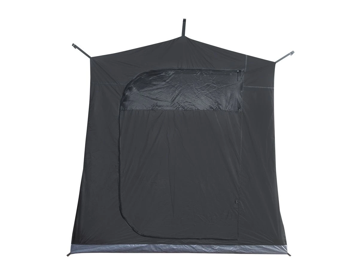 Deze donkere binnentent is voorzien van drie grote ventilatiepanelen die parallel aan de ventilatiepanelen van de Garda 210 geplaatst zijn. In iedere zijwand vindt je een groot ventilatiepaneel en in de achterwand. Ook aan de voorkant van de slaapcabine zit een ventilatiepaneel, deze bevindt zich aan de bovenkant van de deur.