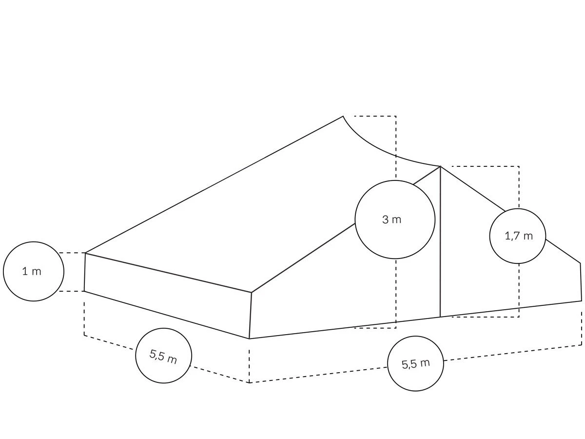 Alle wanden van deze tent kunnen volledig opgerold worden zodat er een zwevend dak ontstaat. Dit is ideaal om op warme zomerdagen een koele schaduwplek mee te creรซren. De Schelde heeft dankzij de verschillende hoogtes een speels karakter. Zo zijn hebben de zijwanden een hoogte van 100 cm en de ingang heeft een hoogte van 170 cm. In het midden is de Schelde maar liefst 300 cm. De nok is voorzien van twee overdekte ventilatieopeningen die zorgen voor een optimale luchtcirculatie.