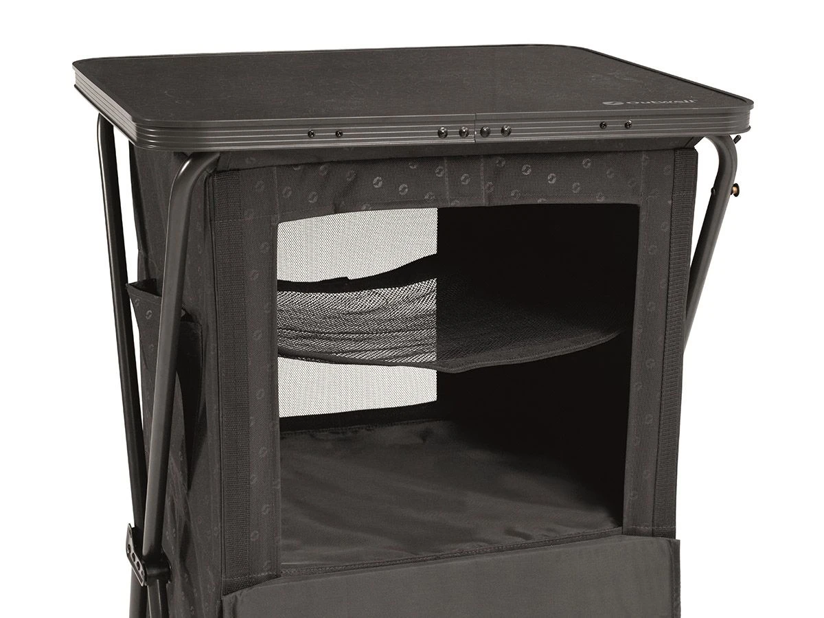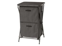 Deze campingkast is binnen enkele seconden in en uit te klappen en er is geen montage nodig. Het inklapbare frame is gemaakt van aluminium met daaroverheen een polyester bekleding. Het blad is gemaakt van laminaat en is niet weerbestendig, laat de kast dus niet tijdens een regenbui buiten staan. De kast wordt geleverd inclusief een handige draagtas voor het makkelijk opbergen en vervoeren van de kast.