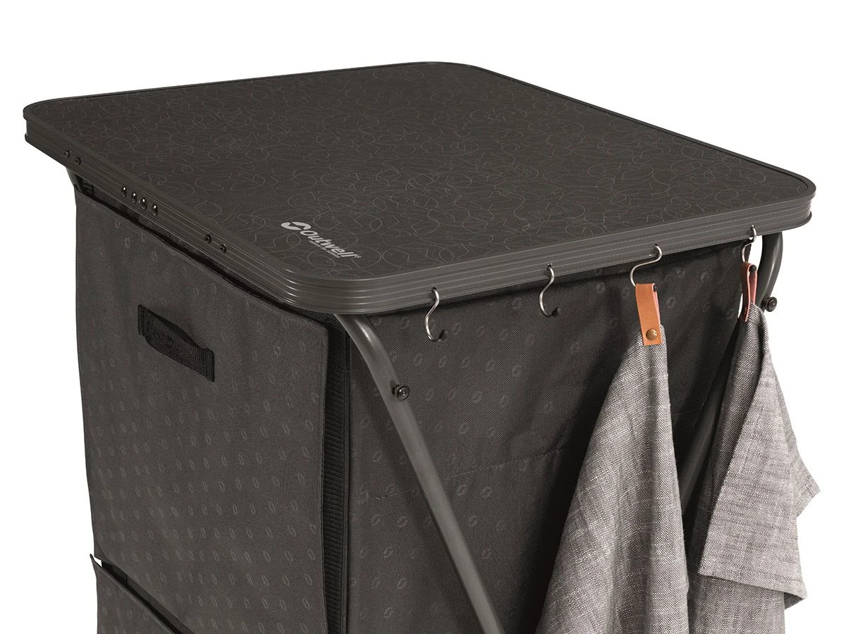 De Domingo campingkast heeft twee grote massieve planken (draagvermogen per plank tot 10 kg) en een gaasplank bovenin (draagvermogen tot 5 kg). Aan de zijkant van de kast bevindt zich een klein opbergvakje voor bijvoorbeeld je zonnebrandcrรจme die je elk uur even wilt gebruiken. Aan de achterkant zit een deel mesh gaas voor een goede ventilatie en luchtcirculatie. Verder zitten er aan de zijkant een aantal haakjes waar je bijvoorbeeld je hand- en theedoek aan kunt ophangen.