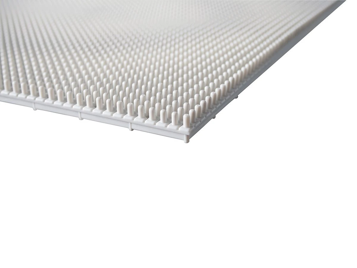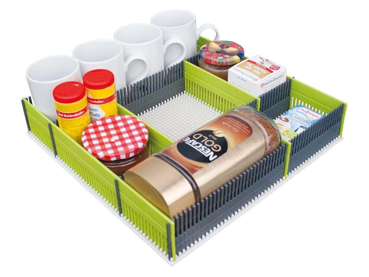 De noppenplaat is de basis van dit camper opbergsysteem. De witte plaat is geperforeerd en kan daarom zelf worden ingekort tot gewenste grootte door op maat te snijden. De noppenplaat vormt een stabiele verbinding met de verdelers (niet inbegrepen), perfect voor het vervoer van glas en porselein.